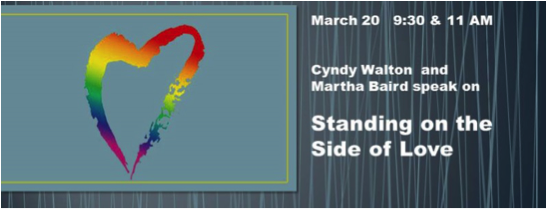 Cyndy Walton and Martha Baird are speaking on Standing on the Side of Love, an interfaith organization with the goal of harnessing love's power to challenge exclusion, oppression, and violence based on sexual orientation, gender identity, immigration status, race, religion, or any other identity.