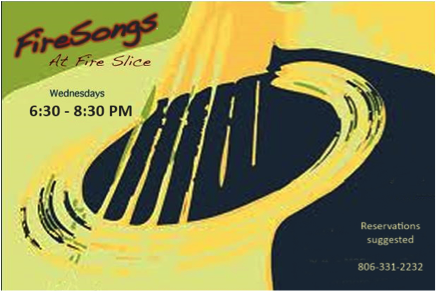 The shows are at Fire Slice Pizzeria (7301 SW 34th Space 10, Summit Shopping Center) on Wednesdays from 6:30 - 8:30 PM. It's a listening environment, so talking is discouraged in the concert room while the show is going on, but this makes it a much nicer environment, and of course Fire Slice has wonderful food which may be enjoyed throughout the show. There is no cover, but reservations are suggested to guarantee seating in the listening room. Call (806) 331-2232. The artist performing April 6 is Tennessee Tuckness.