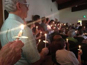 A standing-room-only crowd gathered at the Fellowship Wednesday night at an Interfaith Community Memorial Service for the victims of the Orlando massacre. Lit candles focused attention on slides of each person killed in the Pulse nightclub by Mateen. Representatives of several faiths spoke words of consolation and numerous musicians performed. Martha Baird served as the emcee at the vigil sponsored by the Amarillo Unitarian Universalist Fellowship.