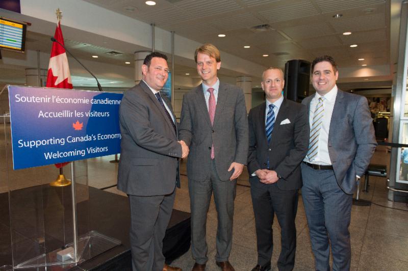 David Goldstein (AITC) avec le ministre de la Citoyenneté et de l'Immigration du Canada Chris Alexander, joints par Daniel Gooch (Conseil des aéroports du Canada) et Marc-André O'Rourke (Conseil national des lignes aériennes du Canada)