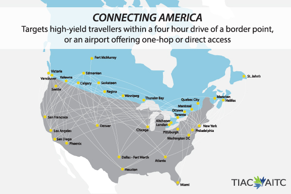 "TIAC has proposed a three-year Connecting America marketing initiative that would target high-yield travellers from U.S. markets within a four-hour drive of the Canada-U.S. border and at airports offering direct or one-hop access to every province in Canada."