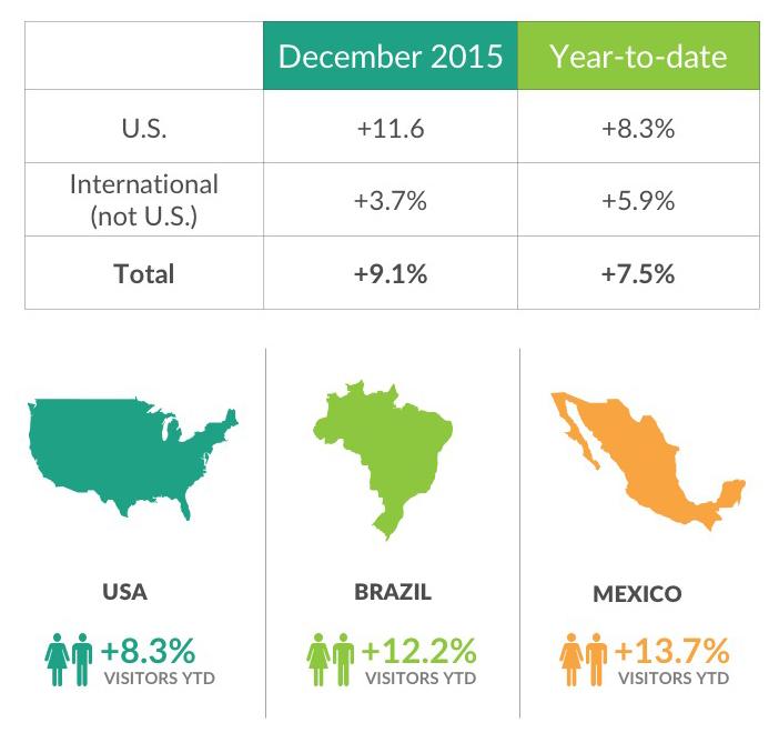 This month, December 2015 numbers were released, and we are pleased to see that overall we have seen a +7.5% increase in visitors to Canada! We are also pleased to see an increase of 8.3% in U.S. visitors in 2015. Also interesting, visitation from Brazil ended the year at an impressive +12.2% boost YTD; some of this is certainly due to the boost from the Pan Am games, but several positive months should allow us to remain optimistic about opportunities in this market. Mexico also ended the year strong, with +30% visitations over December 2014, and +13.7% growth YTD. This is over double the growth of 2013 for the Mexican market, and we can look forward to continued market growth with the promised visa lift this year.