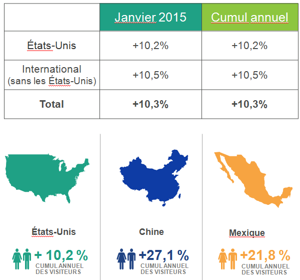 Les premiers chiffres de 2016 pour le tourisme semblent très positifs. En effet, les chiffres de janvier 2016 indiquent un accroissement de 10,3 % des visiteurs au Canada par rapport à 2015! Une grande partie de cette augmentation provient de la Chine qui est l'un des marchés cibles de Destination Canada. Après plusieurs mois d'une croissance ralentie, nous avons bénéficié du plus grand nombre de visiteurs chinois en janvier depuis toujours et de la croissance, en pourcentage, la plus importante depuis 2012. Les visites sont à la hausse de 27 % par rapport à janvier dernier, avec un total de 30 823 visiteurs. Le Mexique a commencé l'année en force, avec 21,8 % de plus de visiteurs par rapport à janvier 2015. Nous prévoyons aussi une croissance du marché européen, la France et l'Allemagne ayant affiché une croissance de 5,6 % et de 7 %, respectivement. Les chiffres de 2016 sont très encourageants par rapport à 2015, ce qui était l'une des meilleures années en termes de visiteurs internationaux au Canada depuis près d'une décennie où le Canada a surpassé le taux de croissance du tourisme mondial de plus de 2 %. En 2015, les visites d'une nuitée des États-Unis étaient à la hausse de 8,3 %, et cette augmentation était avant le lancement du programme Accueillir l'Amérique, le nouveau programme de marketing du tourisme récréatif ciblant les États-Unis et dirigé par Destination Canada. Nous sommes sûrs de voir encore plus de succès pour le reste de 2016!