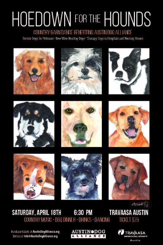 We invite you to a fun evening of dinner, dancing, and drinks at our first annual Country Barn Dinner Dance Fundraiser: Hoedown For The Hounds. Generously hosted by Travaasa Experiential Spa in Austin, this event is going to be a night to remember. Most importantly, it will help fund our on-going programs for the community: Hounds For Heroes, S+CORE! Job Skills Training, and Pet Therapy Outreach.