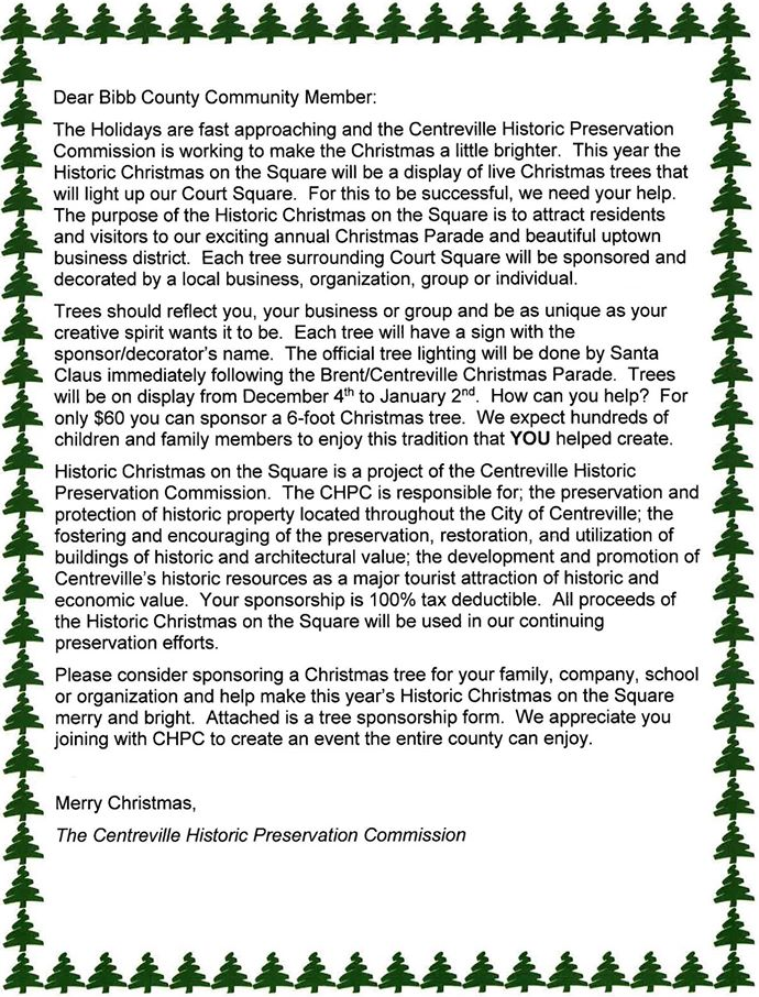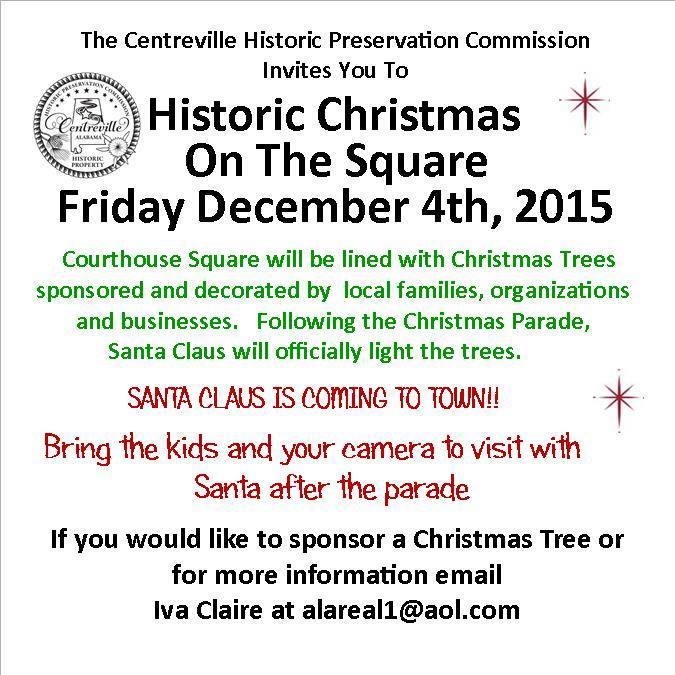 * Christmas on the Square - Friday, December 4th at 6 PM. Represent your business with a festive Christmas tree on the courthouse lawn. Call (205)926-5695 for more information.