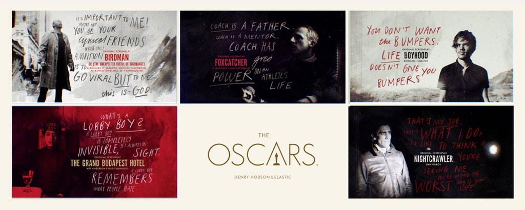 But I'm guessing most of the folks reading this, couldn't help but notice the 2015 title sequences, created under the guiding hand of Henry Hobson-they were stellar.Thanks for Chris Miller for pointing us to them.This year's Best Picture Oscar Nomination Title Sequences by Henry Hobson... Here > https://vimeo.com/1203162332015 Production Design Nomination Title Sequence... Here > https://vimeo.com/38705523Partial of the original screenplay frames... Here > https://pbs.twimg.com/media/B-gJ1rhCAAAIo70.jpg:largeHobson's bio from IMDb.com...Here > http://www.imdb.com/name/nm3918746/?ref_=nv_sr_1Also from his portfolio: The Walking Dead title sequence... Here > https://vimeo.com/25427990Hobson's website (and portfolio)..Here > http://www.henryhobson.co.uk/An interview with Slate... Here > http://www.slate.com/blogs/browbeat/2015/02/23/henry_hobson_interview_meet_the_man_behind_the_oscars_beautiful_animated.htmlLooking for an interesting, fresh typeface?