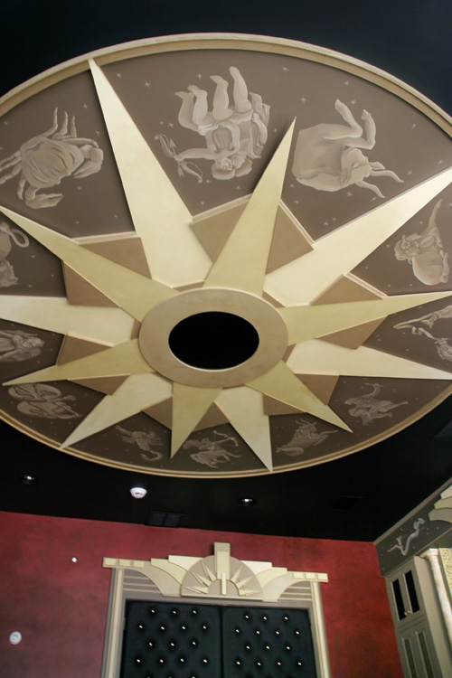 Classical astrology, anyone? This ceiling in a media room has a sepia collection of the twelve signs of the zodiac surrounding the art deco starburst that contains the electronics.