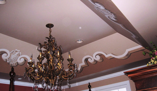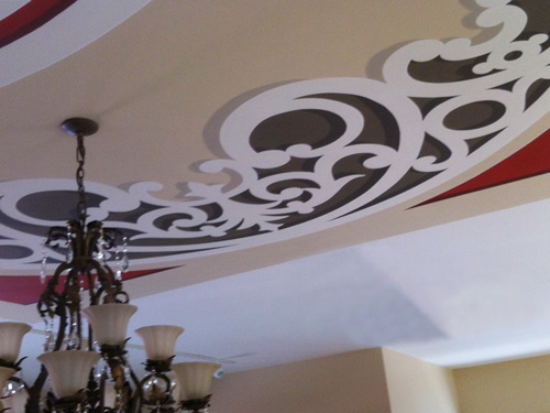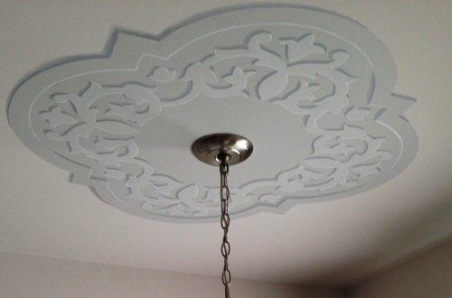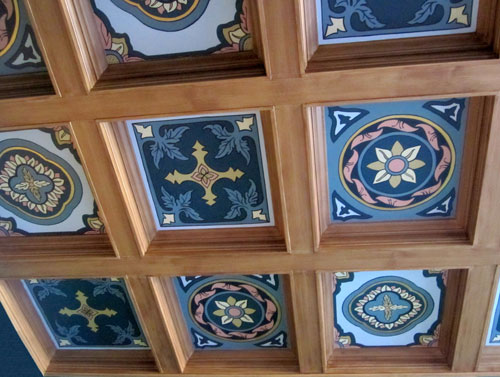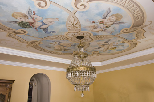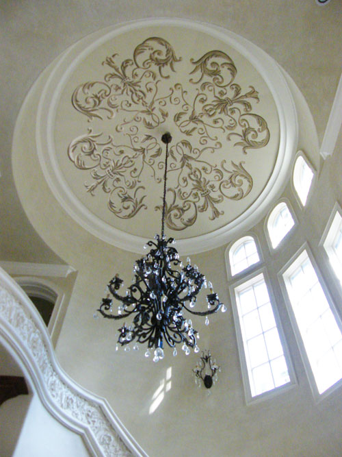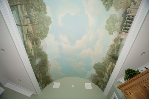 A ceiling treatment does not have to utilize the entire ceiling. Here are two trompe l'oeil medallions that add focus but are modest in dimension.