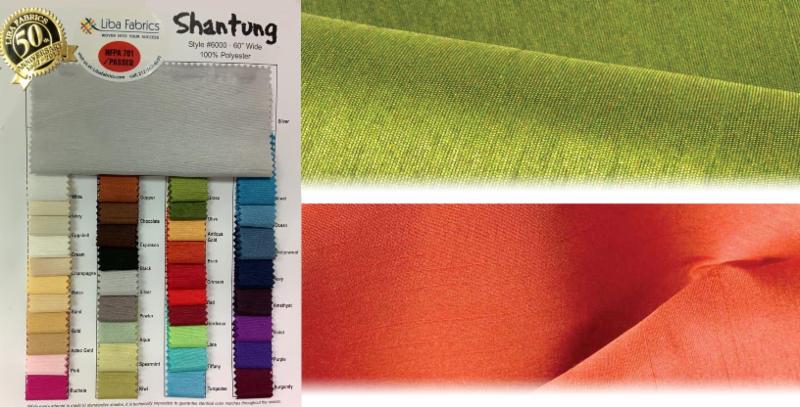 Liba Fabrics is proud to reintroduce you to our Shantung fabric. It is beautiful, washable, durable, 62" wide, and made from the highest quality flame retardant yarn. This fabric is Inherently Flame Retardant, and it will not wash out!