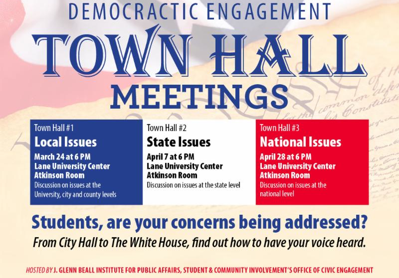 Students, community members and public officials are invited to participate in a series of Democratic Engagement Town Hall Meetings focused on local, state and national issues facing students today. The second Town Hall meeting will focus on state issues. It is free and open to the public.