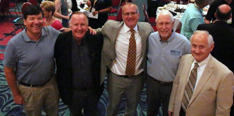 Left to right: Doug Domin, Phil Douglas, Paul Hahn, Jim Bland, Charles Dunahoo. At the MNA luncheon, Doug, Phil, and Charles honored Jim with recollections of God's work through MNA during the time of Jim's leadership.