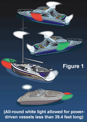 If you are planning to stay out after sunset, it's time to check your running lights. See the picture below to see what your light configuration should be.