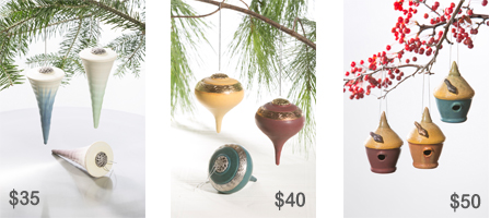 Ornaments are back! The three designs shown here - Icicle, Classic Spindle, and Birdhouse- are each available in 3 color options. These ornaments are available for order online or by phone (888-704-POTS) only. These limited editions are available while supplies last, so please place your order soon.