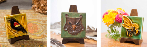 We're now offering tiles in a new, smaller size! These three-inch-square tiles are available in eight different designs. Pair with a custom-made stand from our woodshop for a complete presentation. They're affordable and small enough to fit just about anywhere. At only $35 a tile plus $24 a stand, they make great gifts!