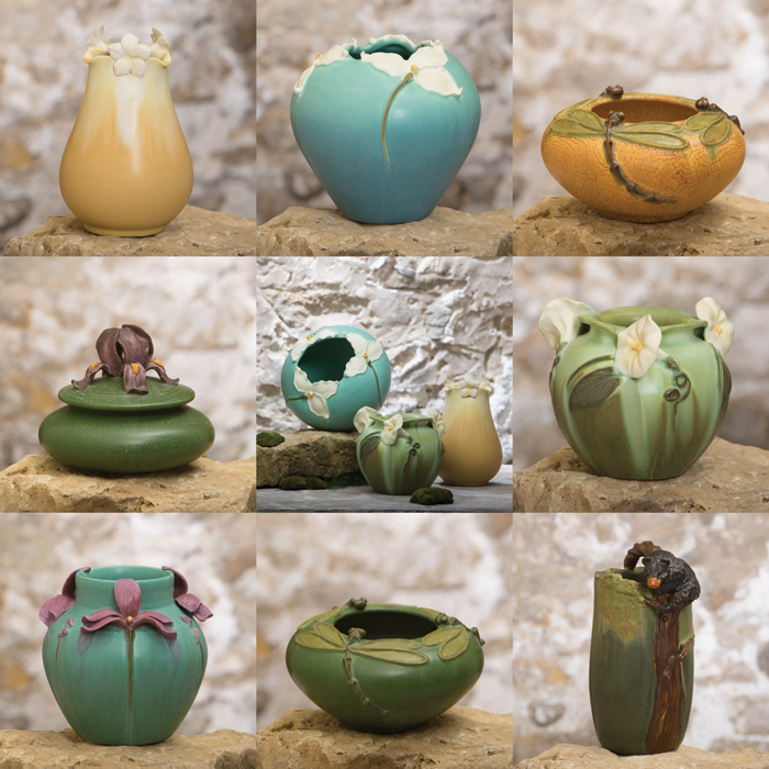 Spring is here at last and so are our fresh hues. We have glazed several of our floral pieces with pastel shades - Aquamarine, Seaspray Blue, Light Olive and Satin Yellow. They shine in their soft glazes just like the beautiful light that we are given at this time of year. Enjoy a Dancing Dragonfly Bowl or Graceful Iris Jar re-envisioned in Leaf Green or perhaps a Bear's Dilemma in Chestnut and join us in celebrating Spring!