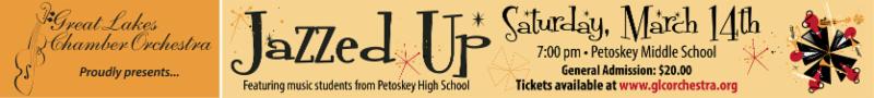 The Great Lakes Chamber Orchestra announces its forthcoming jazz concert entitled "Jazzed Up." The concert is scheduled for Saturday, March 14th, 7 p.m. and will be held at the Petoskey Middle School located at 801 Northmen Drive. Jazz takes center stage with works including Stravinsky's Ragtime for 11 Instruments, Gershwin's Lullaby for Strings, and tributes to Copland and "Duke" Ellington. In addition the Petoskey High School Jazz Band will perform the Ellington tribute with the Great Lakes Chamber Orchestra. In a truly brilliant finale solos are passed around the orchestra and everyone swings! Tickets are available at area chambers of commerce including Petoskey, Charlevoix, Boyne City, Harbor Springs and East Jordan, online at www.glcorchestra.org or by calling the orchestra office at 231-487-0010.