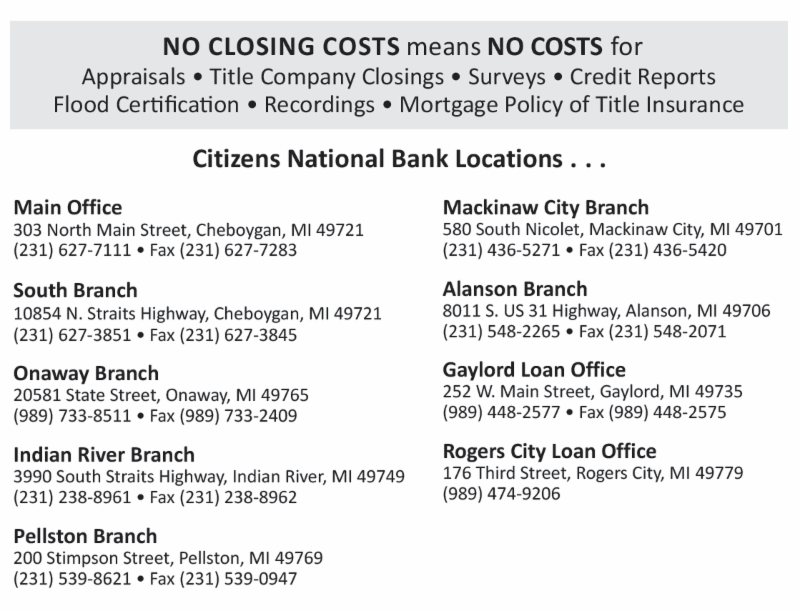 No Closing Costs at Citizens National Bank - Really, NO COSTS!
