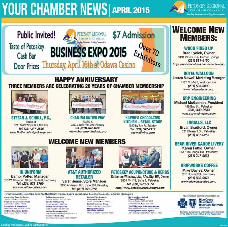 Check out today's Petoskey Chamber advertisement in the Petoskey News Review. It is Sponsored by Blue Cross Blue Shield and it welcomes new members, features anniversary pictures, ground breaking pictures, welcome new member pictures and ribbon cutting pictures. It lists the Member Insurance Agents who offer Blue Cross Blue Shield Health Insurance. A small image of the ad is above. You can see the ad in today's edition of the paper or on the chamber website here.
