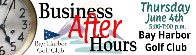 Business After Hours is June 4th at the Bay Harbor Golf Club from 5:00 p.m. - 7:00 p.m. This will be the last BAH until the end of August so come out and celebrate the upcoming Summer season at this beautiful location. Come out for great networking opportunities, hors do'oeuvres, cash bar, door prizes and more. BAH events are well attended and admission is $7 for members and $12 for not-yet members.