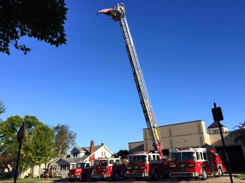 Photo credit Sean Miller/Petoskey News Review. Sean Miller/News-Review. The Petoskey fire department raised an American flag in front of City Hall today.