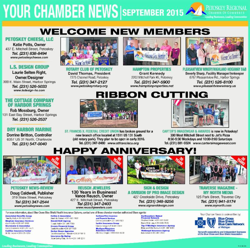 Check out the Petoskey Chamber advertisement in the Petoskey News Review today. It is Sponsored by Blue Cross Blue Shield and it welcomes new members, features anniversary pictures, ground breaking pictures, welcome new member pictures and ribbon cutting pictures. Great publicity for members.