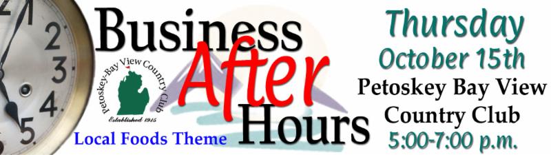 The Next Business After Hours is Coming Soon - October 15 at the Petoskey Bay View Country Club from 5:00 p.m. - 7:00 p.m. Admission cost is $7 for members; $12 for not-yet members. Join fellow chamber members for networking opportunities, along with hors d'oeuvres, cash-bar*, refreshments and door prizes for this month's sponsors.