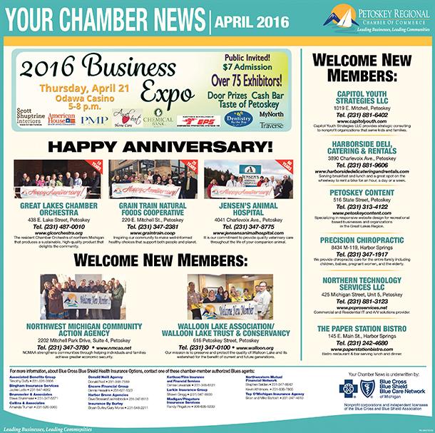 Check out the Petoskey Chamber advertisement in today's Petoskey News Review. It is Sponsored by Blue Cross Blue Shield and it welcomes new members, features anniversary pictures, welcome new member pictures and ribbon cutting pictures. It lists the Member Insurance Agents who offer Blue Cross Blue Shield Health Insurance.