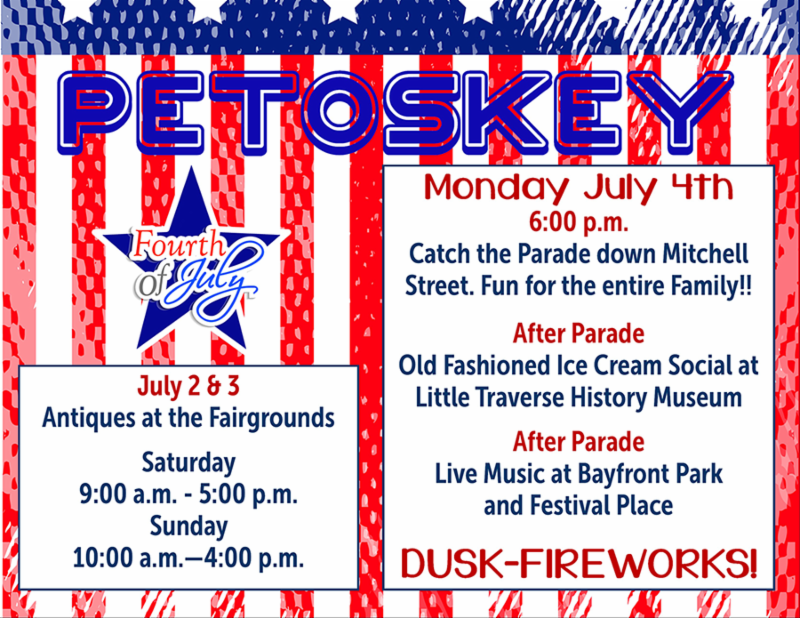 Antiques at the Fairgrounds is Saturday July 2nd and Sunday July 3rd. Head to the Emmet County Fairgrounds for a huge array of high quality antique merchandise from the smallest collectibles (jewelry), to a wide range of antique furniture, pottery, china, textiles, prints and more. Admission is $5.00 per person (good for both days), children under 15 admitted free. Parking is FREE! Show times are 9:00am - 5:00pm on Saturday and 10:00am to 4:00pm on Sunday. Can't make this show? Catch the one on August 6 & 7, 2016 - same location. For more information, visit www.antiquesatthefairgrounds.com. Join Bay Harbor for a full weekend of holiday fun! On July 3rd come down to the Village at Bay Harbor for Fireworks and enjoy an always amazing show by the Petoskey Steel Drum Band from 8:00 - 10:30 p.m., as well as balloon twisting and fun with Jania Taylor and face Painting will be available for the kids as well. Fireworks Display over Bay Harbor Lake will commence at dusk. On July 4 catch the Parade on Main Street at 11:00 a.m., an exciting parade for the whole family! Don't miss the most unique Fourth of July parade in northern Michigan! Bay Harbor has the highest use of GEM Cars per capita in the world, and we decorate them and show them off down Main Street! The Petoskey Area Jaycees invite you and your business to be a part of Petoskey's Stars & Stripes Celebration on Monday, July 4. The parade will take place at 6 pm following the traditional route, with entertainment and fireworks at the waterfront following. The Stars & Stripes event is 100% Volunteer Driven and 100% Community Funded. Let your business and family be a part of the celebration by donating today. Visit www.petoskeystarsandstripes.com and hit the donate button to learn more.