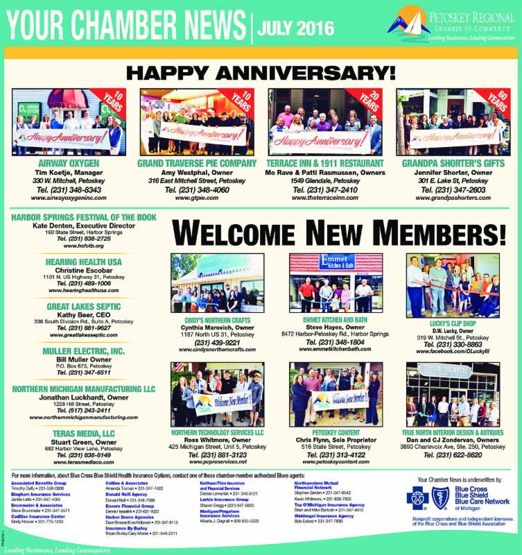 Check out the July Petoskey Chamber advertisement in today's Petoskey News Review. It is Sponsored by Blue Cross Blue Shield and it welcomes new members, features anniversary pictures, welcome new member pictures and ribbon cutting pictures. It lists the Member Insurance Agents who offer Blue Cross Blue Shield Health Insurance.