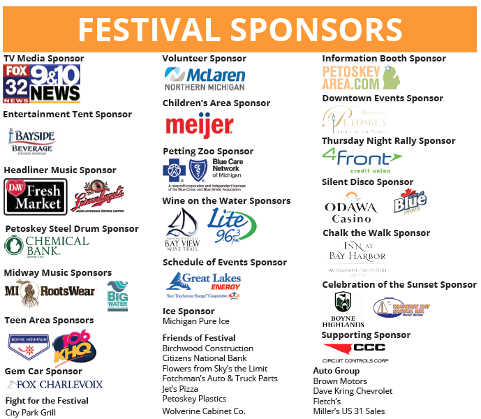 In addition, the entire staff of the Petoskey Regional Chamber of Commerce would like to extend a heartfelt THANK YOU to all the performers, vendos and our amazing sponsors of this year's Festival on the Bay. In addition, we are humbled and grateful for the overwhelming support from volunteers. Without the support of the entire community the Festival would not be possible!