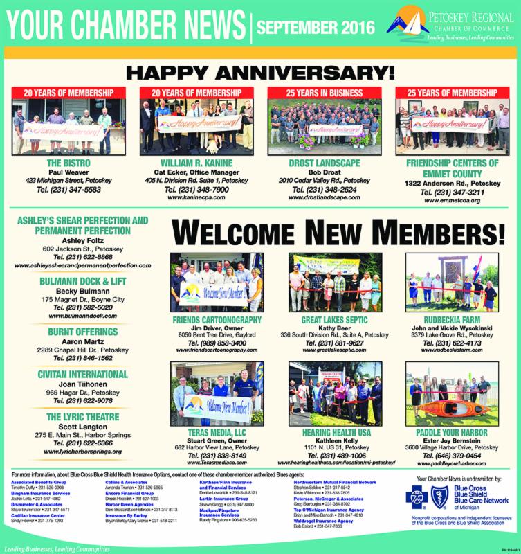 Check out the September Petoskey Chamber advertisement in today's Petoskey News Review. It is Sponsored by Blue Cross Blue Shield and it welcomes new members, features anniversary pictures, welcome new member pictures and ribbon cutting pictures. It lists the Member Insurance Agents who offer Blue Cross Blue Shield Health Insurance.