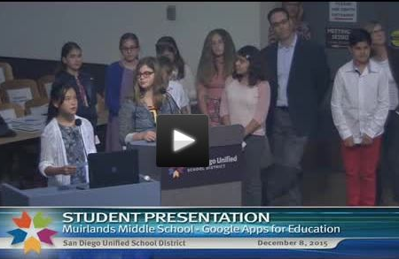 A group of awesome Muirlands 6th grade students presented to the SDUSD Board of Education on Tuesday, December 8, 2015. These students were sharing their work and experiences using Google Apps for Education (GAFE) this year, particularly in their Science class as part of a District pilot. The Board and others were very impressed!