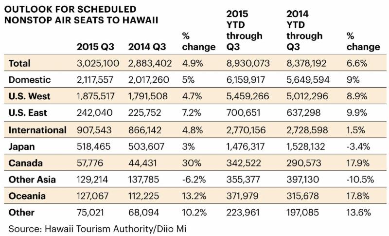 Below is a graph from the Hawaiian Tourism Authority that shows year-over-year growth in in scheduled airline seats through the 3rd quarter of the year. They are forecasting 4.9% increase in the 3rd quarter, and a 6.6% increase for the first three quarters of the year.
