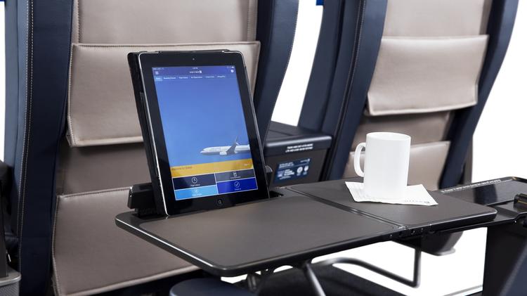 United Airlines revealed a new premium cabin seat. Some things stay the same: number of seats, seat pitch of 38". The new navy and champagne leather seats will be wider - while the aisle width will shrink from 28" to 24" to accommodate them. They will also feature a new seat try (pictured at left) for positioning iPads or other mobile devices upright for easy viewing.