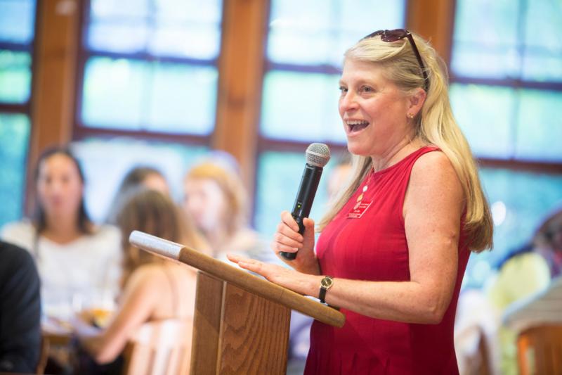 | | The Graduate School's Associate Dean of Academic and Student Affairs, Jan Allen, congratulating students at the NSF GRF Reception |