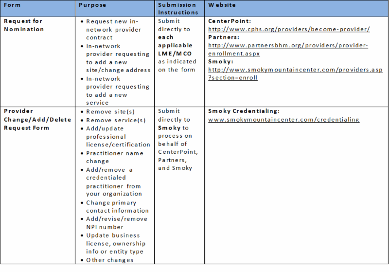 Revisions to the Request for Nomination form include network changes that must be evaluated by individual LME/MCOs. These forms will continue to be submitted directly to the LME/MCO.