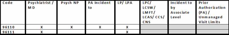 Smoky Mountain LME/MCO has made the business decision to follow the requirements for billing codes 96110 (developmental screening) and 96111 (developmental testing) that exist in Clinical Coverage Policy (CCP) 8C. Please see the excerpt below taken from the table on pages 31-32 of the referenced CCP. For more detailed information, please read the entire CCP.