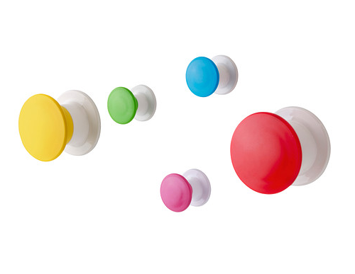 These colorful knobs are perfect for hanging diaper bags, tiny jackets, and other baby gear. They attach with adhesive or with screws and come 5 in a pack.