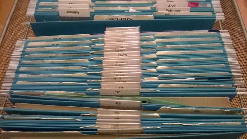 The second paper management system, the tickler file, is designed to manage papers that you need to keep for the short term, such as invitations, bills to be paid, or tickets to an event. This file consists of one file for each day of the month (31 days) plus one file for each of the 12 months of the year. Keep these 43 files in a desktop hanging file box on your kitchen countertop or home office, where you will see and use it regularly. Here you will put all the random pieces of paper that you need to keep track of but do not want cluttering your countertop.