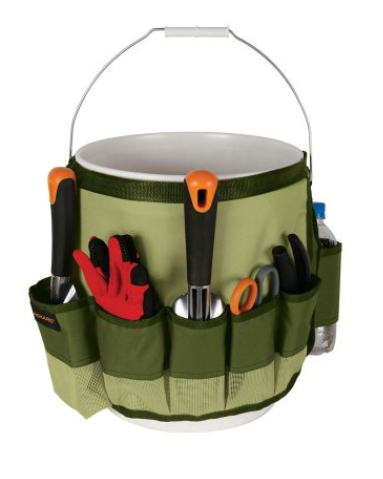 - This handy garden bucket caddy is a canvas organizer that wraps around your 5-gallon bucket to hold gardening tools, cell phone, or water bottle as you work in your beds.
