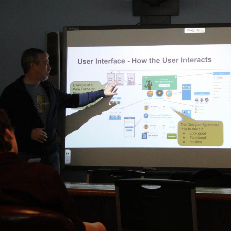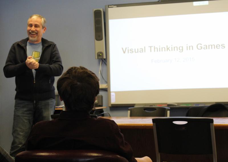 On Thursday, February 12, Eric von Coelln (in photos above), parent of Upper School student Karl von Coelln, spoke to students in our new Graphic Communications class about his experiences working at several game design companies. Mr. von Coelln showed students how games are designed and spent time discussing the different stages of mobile game development. He finished by advising students on how to get a job as a game designer, including recommending that they learn Adobe PhotoShop and Illustrator in order to create a portfolio for prospective employers. He also provided names of top portfolio download sites for job seekers in the design field.