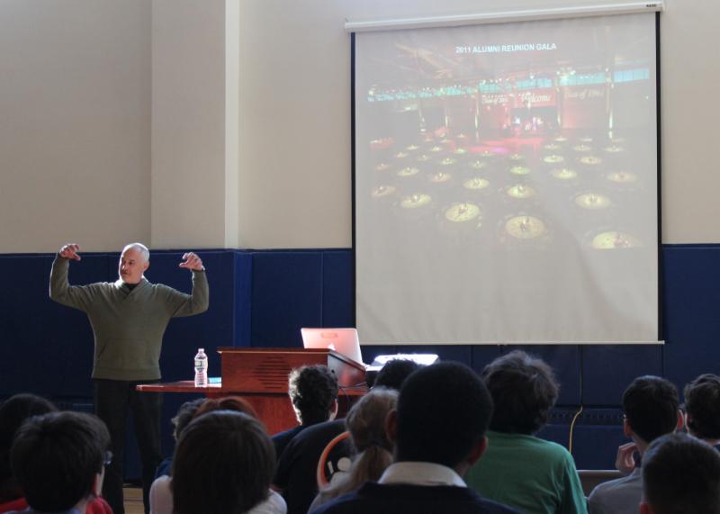 On Wednesday, February 11, Larry Lustberg (in photos below), parent of Lower School student Jackson Lustberg, spoke to juniors and seniors about his experiences in the field of live event lighting and design. Mr. Lustberg owns a company called Stortz Lighting, a major special events lighting and design firm in the New York City area. He showed students photos of some of the major events that his company has designed for clients, including weddings, corporate affairs, and sports events.
