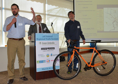 Joey Hood of Human Nature (from left), Frank Henson of Queen City Bike and co-chair of the Regional Trails Alliance, and Jason Reser of Reser Bicycle Outfitters prepare to present Brewster Rhodes of Green Umbrella with a bicycle at the Regional Trails Summit on March 27. Rhodes is retiring later this year.