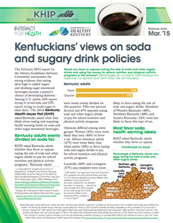 The Kentucky Health Issues Poll (KHIP) has found that Kentucky adults are nearly equally divided about whether soda and other sugary drinks should be taxed to pay for school nutrition and physical activity programs. Fifty-one percent favored and 47 percent opposed a tax. Women (55 percent) were more likely than men (46 percent) to favor a tax. African American adults (67 percent) were more likely than white adults (50 percent) to favor a tax. Louisville (60 percent) and Lexington (57 percent) area residents were more likely to favor taxing the sale of soda and sugary drinks compared with other areas in Kentucky.