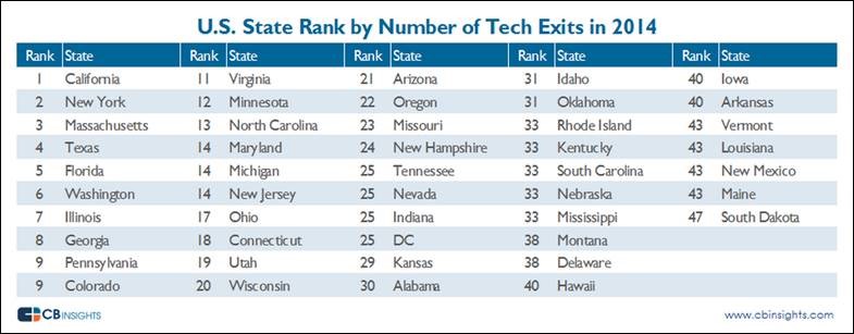 MI tech start-ups fared well exiting from venture capital support either to IPO's or being acquired by larger companies according to CB Insights. MI had the 14th highest number of "tech exits" in 2014. The higher rate of "tech exits" suggests MI's venture-backed companies are becoming more successful at developing commercially viable products and services. Read more. . .