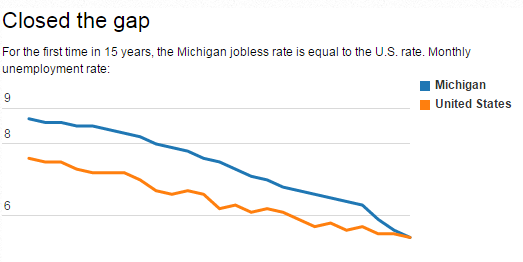 Marking the 20th straight month of decline, Michigan's unemployment rate dropped to 5.4% and matches the national average for the first time in fifteen years --since September 2000!