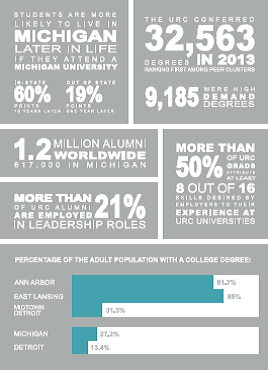Michigan's leading research universities are magnets for topnotch talent, attracting, developing and retaining highly skilled individuals to propel Michigan's economy into the future, a new report confirms. With more than $2.1 billion in research and development annually, the University Research Corridor (URC) is one of the nation's top academic research clusters. The URC's members - Michigan State University, the University of Michigan and Wayne State University - engage 12,000 worldclass faculty members and 35,000 graduate students, elevating their undergraduate programs and supporting regional economies. Read more. . .