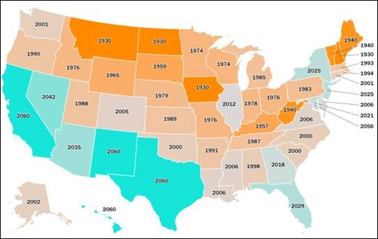 Time prepared this map identifying how each state's current demographics compare to what was or will be the national average by year. For example, Michigan's current demographic mix looks like the nation did in 1985, while Texas currently looks like the nation will in 2060. It's another way of showing how the North Central and Midwestern states are aging more and diversifying less than most states.