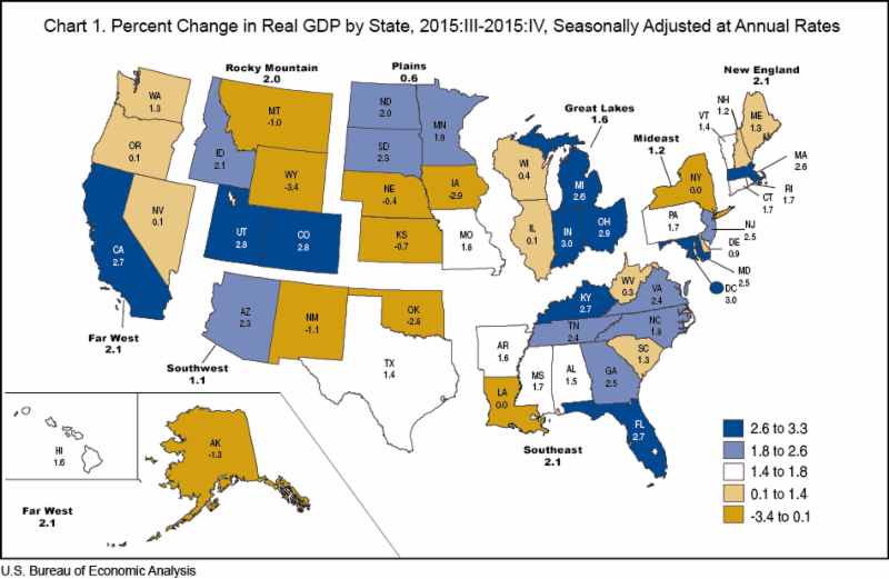 Michigan's real (inflation adjusted) GDP increased 1.4% in 2015, which was below the national growth rate of 2.4%. MI's growth rate ranked 32nd among all of the states in 2015, the same ranking as in 2014. MI's real per capita GDP increased 1.3% in 2015 which was slightly below the U.S. growth rate of 1.5%. This ranked us 19th among all of the states in 2015. MI's real GDP grew slower than the U.S in 2015 for two primary reasons: 1) durable manufacturing, which is a larger share of the MI economy than it is of the U.S. economy, grew slower in MI than the U.S. and 2) government declined more in MI than the U.S. Learn More