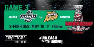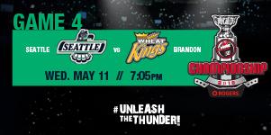 WHL Championship Schedule Game 1 At Brandon 3, Seattle 2, OT Game 2 At Brandon 3, Seattle 2, OT Game 3 Tuesday, May 10 at Seattle, 7:05pm Game 4 Wednesday, May 11 at Seattle, 7:05pm Game 5 Friday, May 13 at Seattle, 7:35pm* Game 6 Sunday, May 15 at Brandon, 5pm* Game 7 Monday, May 16 at Brandon, 5pm* * if necessary